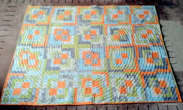 I fell out of love with this quilt pretty early on  - I think it was because it seemed a little limited colour wise but the spot binding really helps to bring it alive a bit.  The orange spots especially have saved the day. I wish I'd put the black blocks where the green blocks are though.